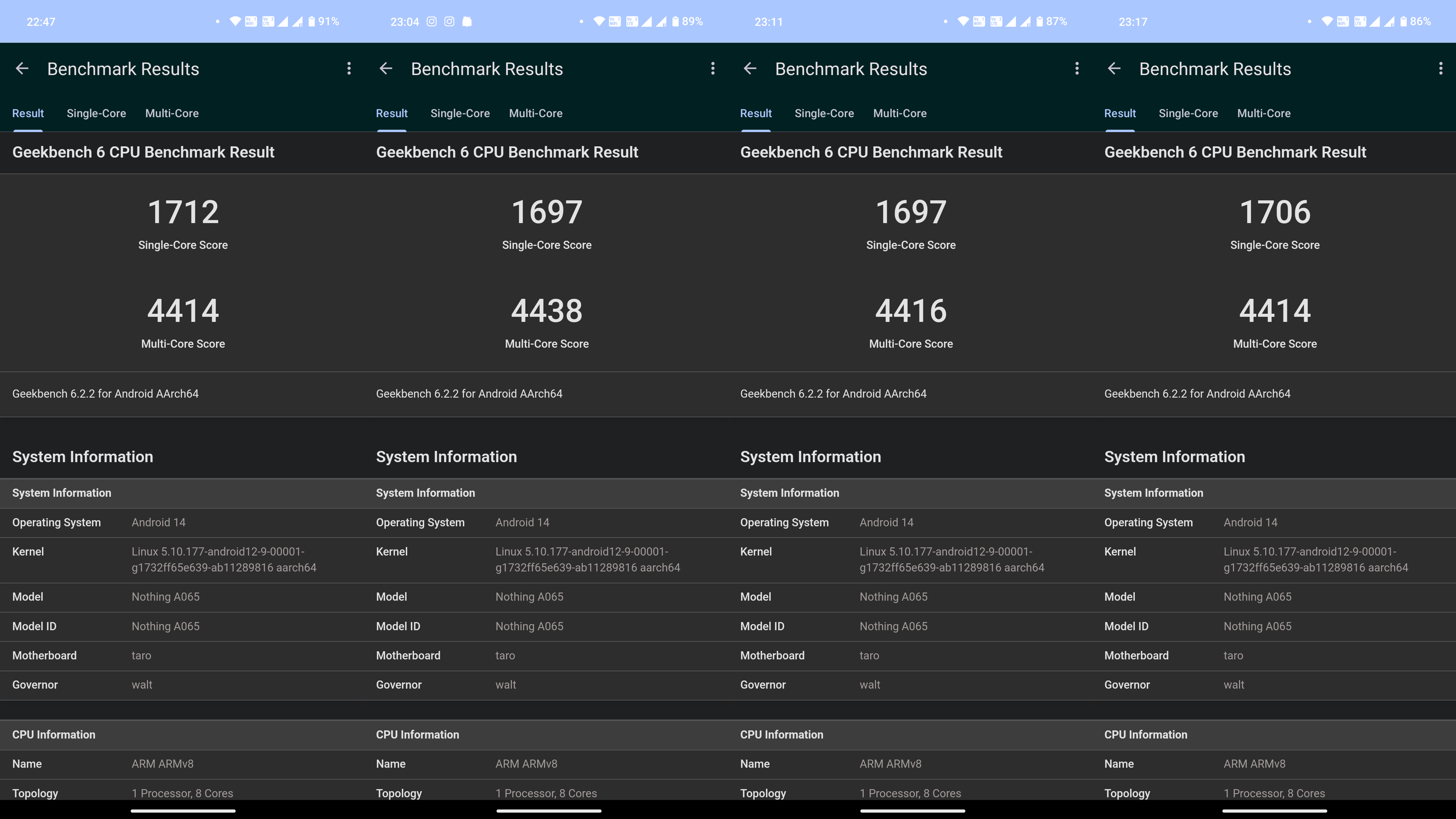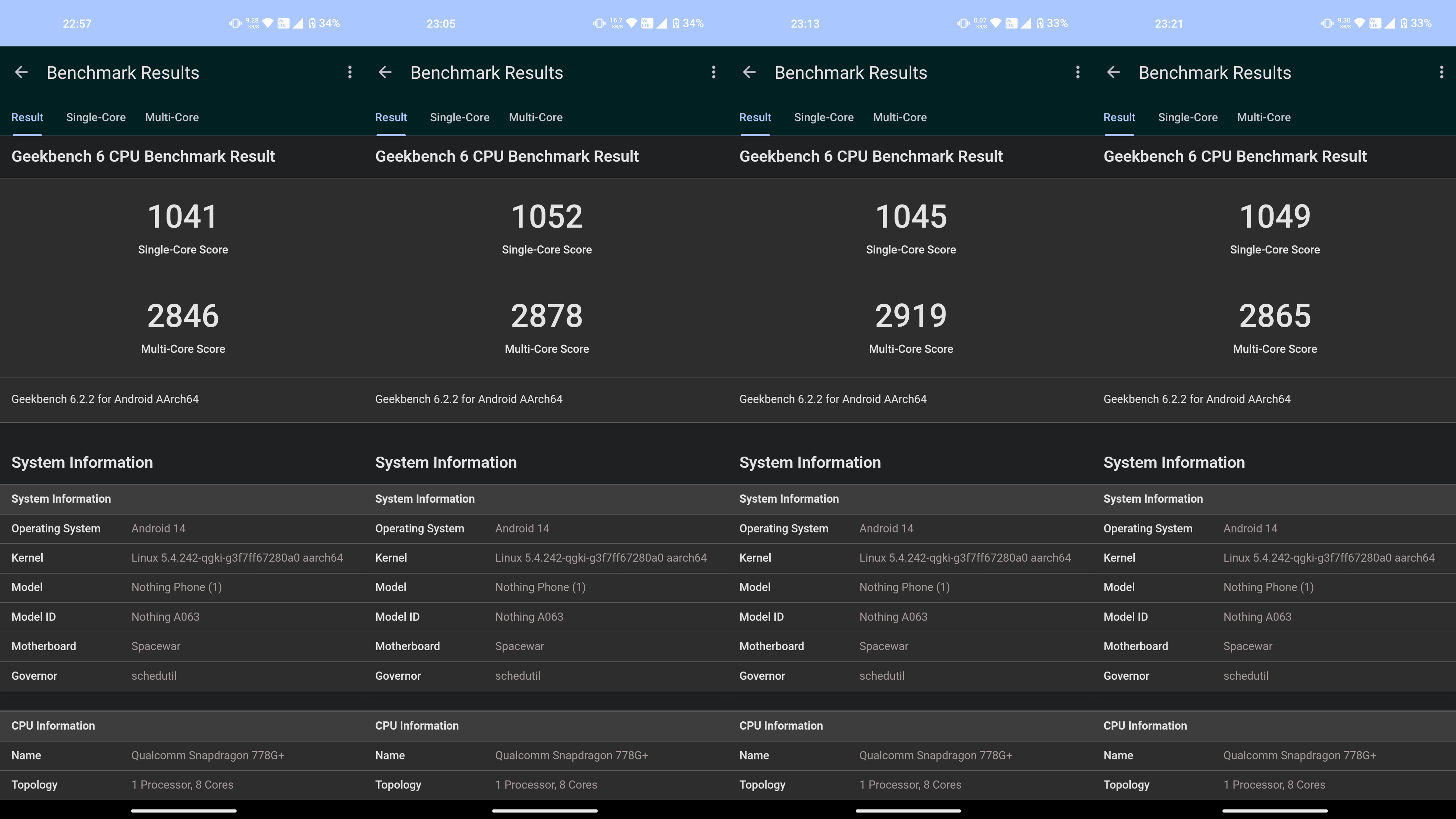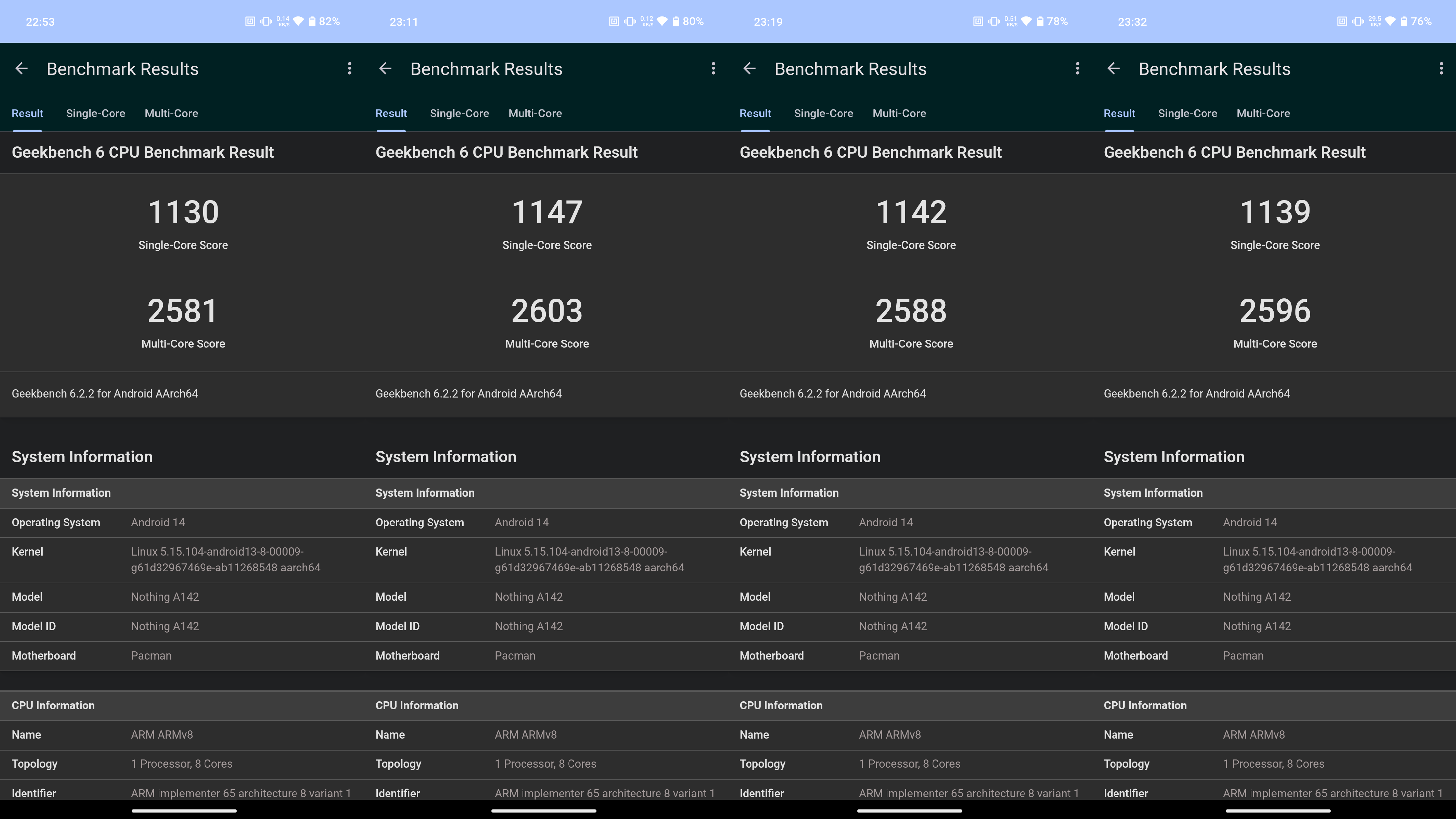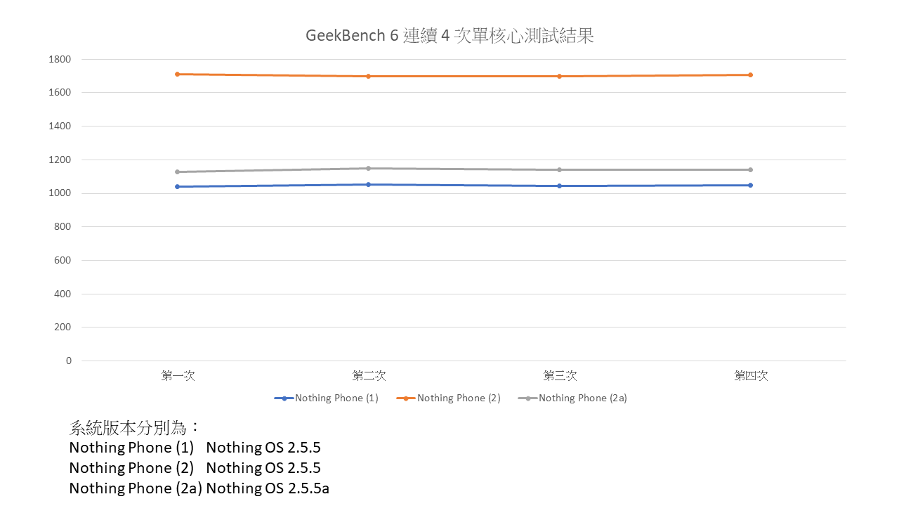 ▲ Nothing Phone (1) NothingOS 2.5.5 GeekBench 6 連續 4 次的測試結果(上圖) ▼ Nothing Phone (2) NothingOS 2.5.5 GeekBench 6 連續 4 次的測試結果(下圖)