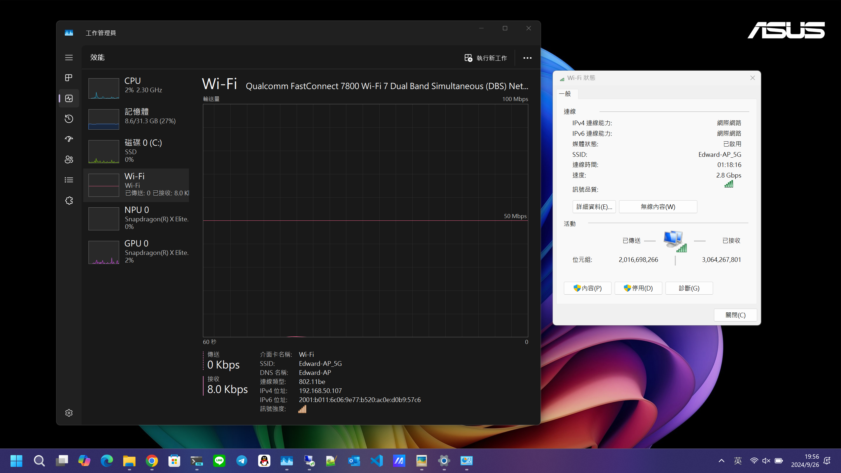為了這次的測試體驗,我也大大的下血本,更換了 ASUS 的 WiFi 7 Router RT-BE88U 高通對於網路通訊相關的技術還是相當優秀的,也因此在 Snapdragon X Elite 產品當中所使用的無線網路卡,也符合 WiFi 7 的要求。 對於我在內網有架設 NAS 並且連接上 2.5Gbps 網路的生產力工作者,可說是一大福音。