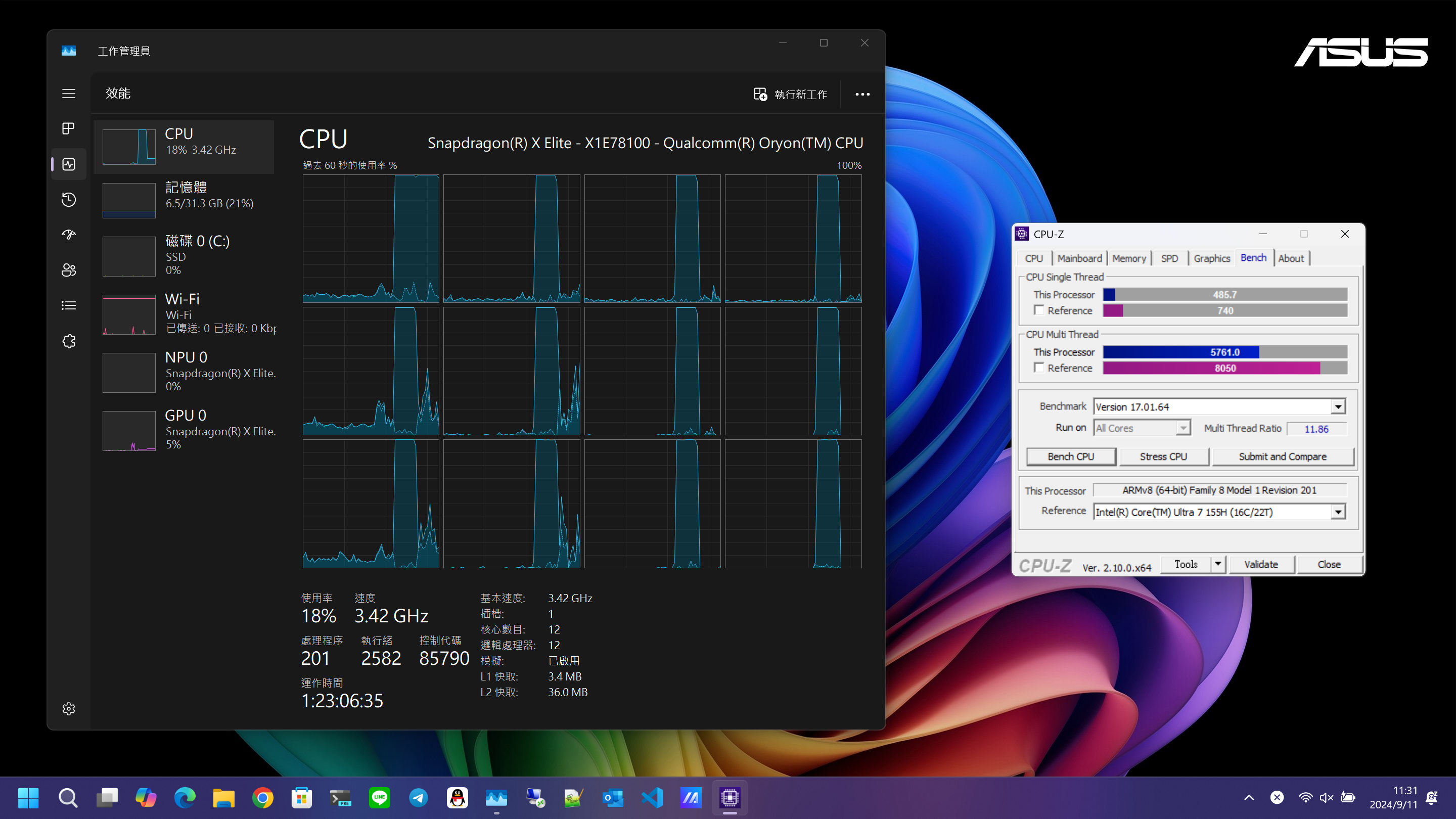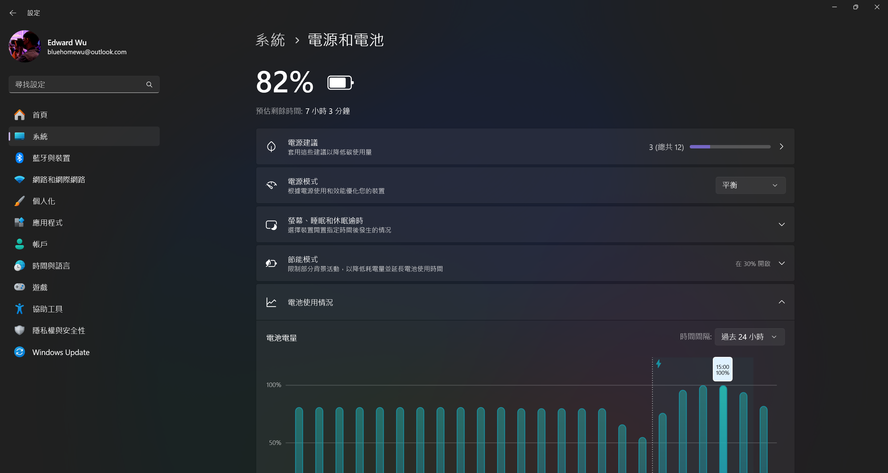 在平衡模式下,剩餘約 82% 的電量時,預估可用時間仍舊長達 7 小時。可見不僅是高通對於 Snapdragon X Elite 產品以及華碩最佳化的效果都是顯而易見的。 在這一個月的使用體驗,我將 ASUS Vivobook S15 攜帶出門到咖啡廳工作,在剛進咖啡廳時,配有插座的座位,都已有人在使用。當下我電池只剩下 80%(前次充電使用了 MyAsus 程式內的「電池保養模式」,也因此沒有充飽就出門了。)歷經接近 8 小時的工作,期間大量使用網路傳輸檔案以及進行許多文書編輯、多開瀏覽器甚至還有花上數小時在進行 coding,透過 Arm 版本的 VScode 連接 WSL2 On Arm64,也算是不小的負載。直到我回到家時,電池還剩下約 20% 左右的電量。