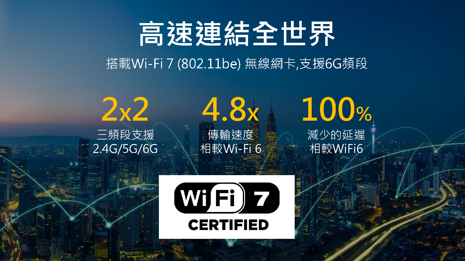 無線連線 | Wi-Fi 7 (802.11be) (三頻) 2*2 + Bluetooth® 藍牙 5.4 無線網卡 |