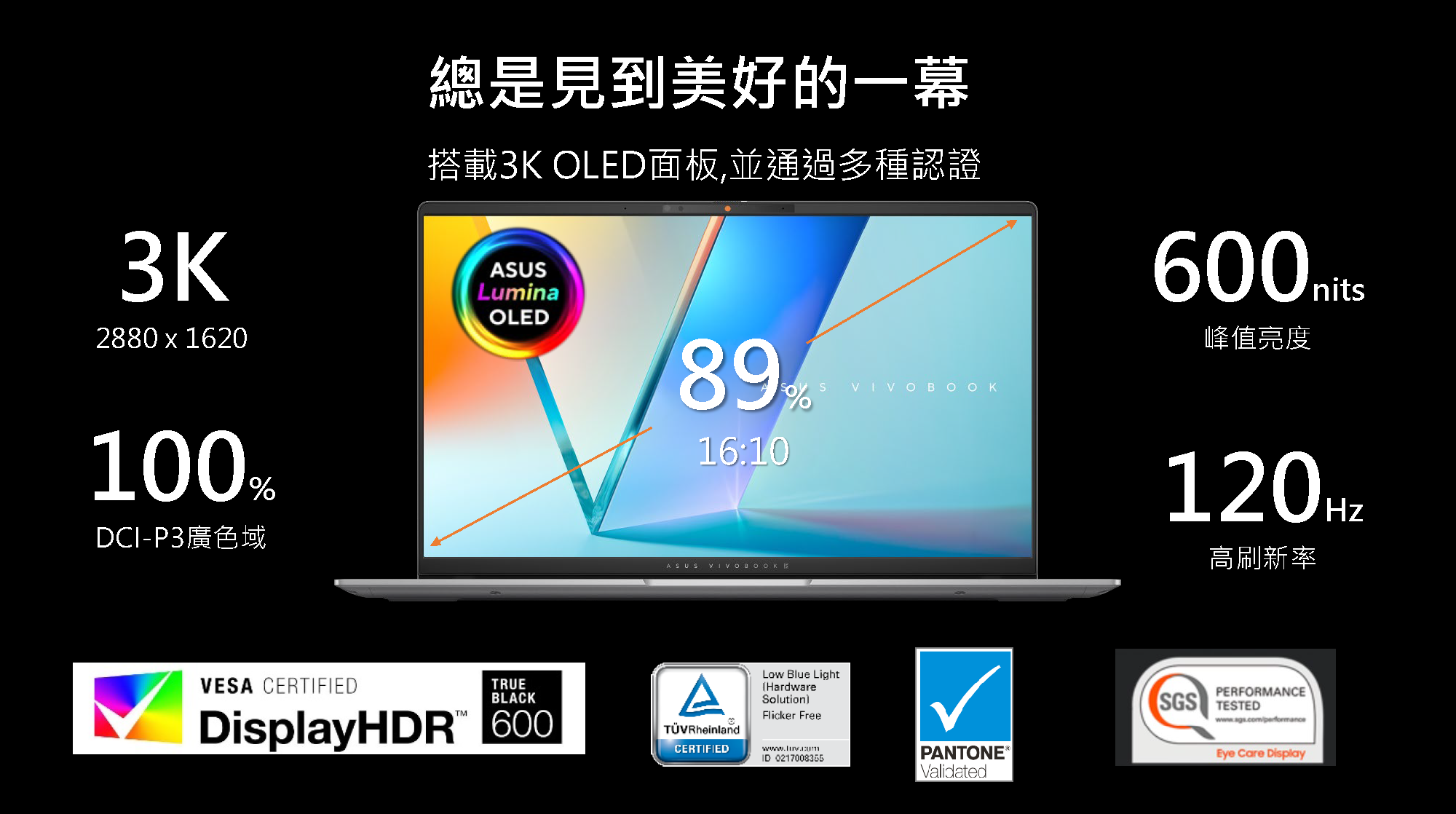 螢幕 | 15.6 吋, 3K (2880 x 1620) OLED 16:9 螢幕長寬比, 0.2ms 疾速反應時間, 120Hz 更新率, 600nits HDR 峰值亮度, 100% DCI-P3 色域, 1,000,000:1, VESA CERTIFIED Display HDR True Black 600, 10.7 億種色彩, 鏡面螢幕, 減少 70% 有害藍光, 德國萊因 (TÜV Rheinland) 低藍光護眼認證, SGS 認證護眼螢幕, 螢幕佔比 89% |