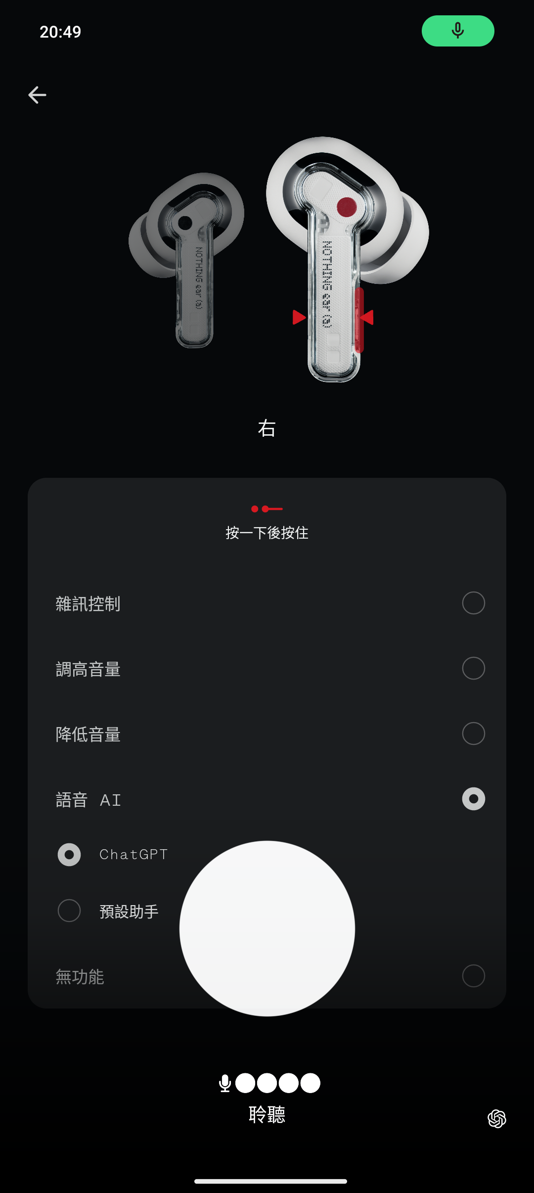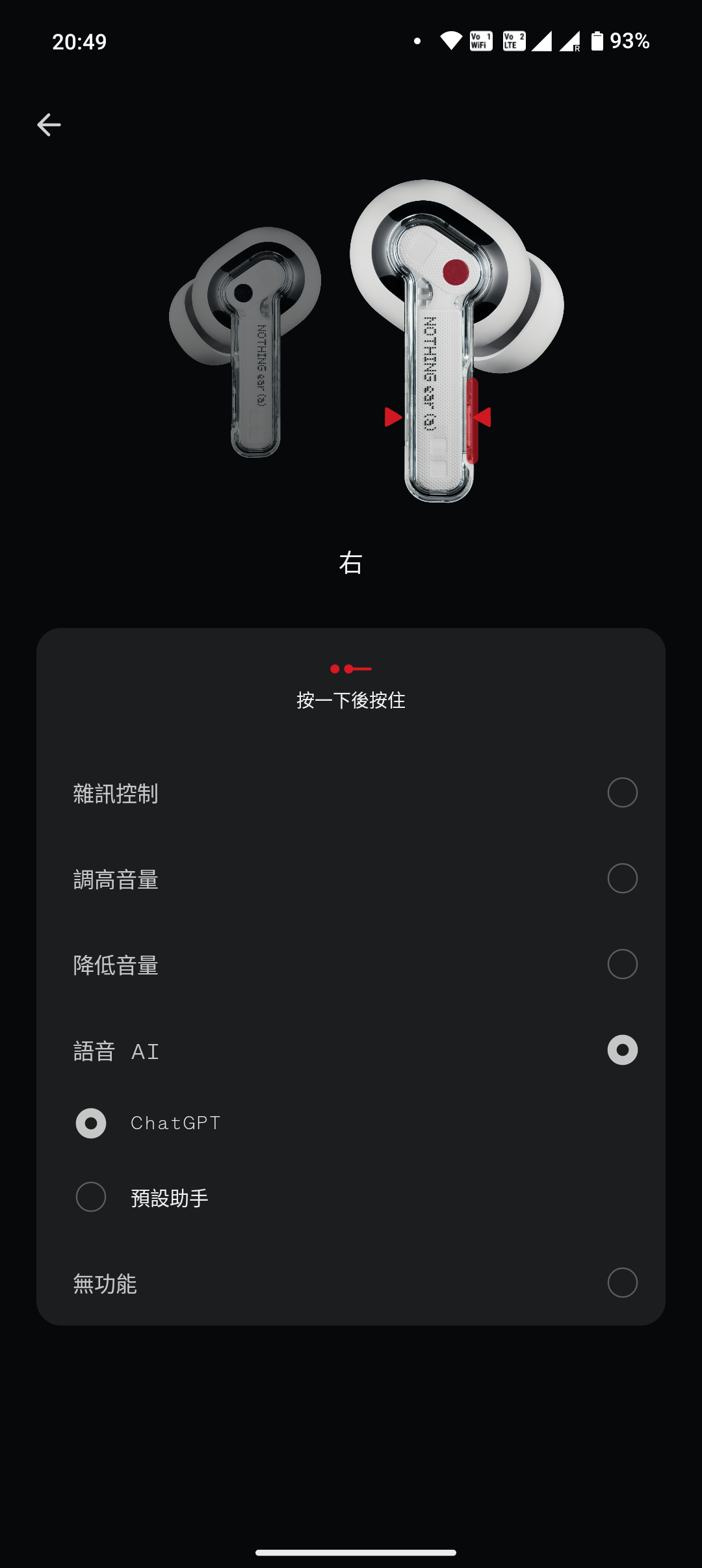 在這次兩款 Nothing Ear 的推出之後,Nothing Tech 也針對目前有在販售的耳機款式(包含)CMF Buds 等產品,推出 OTA 整合於 Nothing X APP 內,進一步支援了 ChatGPT 作為耳機預設的語音助理。 其中,也可以使用最新的語音模型 ChatGPT-4o 來搭配使用。 首先需要使用 Nothing Phone 搭配這些支援的耳機,於 Nothing X APP 內部進行設定。