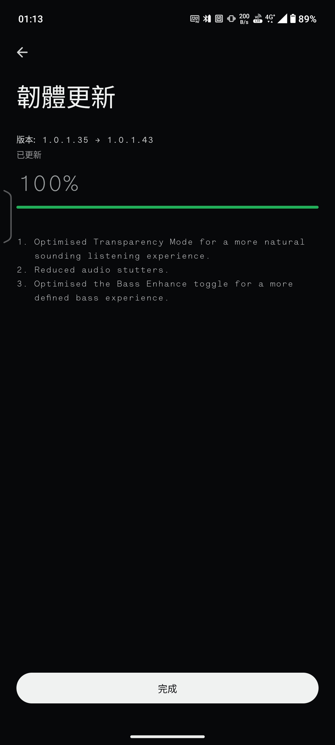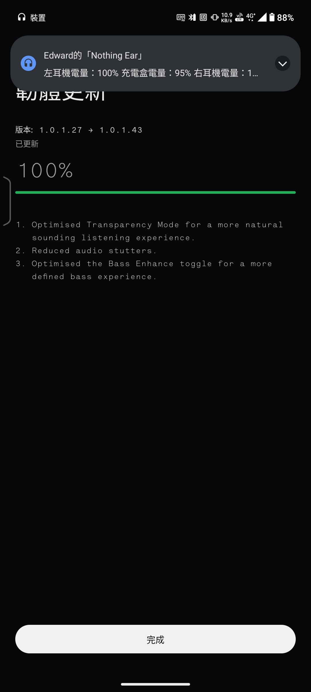 在這一陣子體驗下來,雖然優點多到我感覺這是個物超所值的產品,但缺點也不是沒有。只不過我想這應該在未來的某天可以以 OTA 的形式進行修復。 Nothing Ear 使用 LDAC 編碼在音量較小的時候感覺有些悶悶的 需要把音量調到大約40%(音量條沒有確切百分比供參考),才會稍微正常一些,期待於下次更新修復。 Nothing Tech 也會在 Discord 上推送更新通知,讓所有使用者可以最即時的接收到更新資訊。
