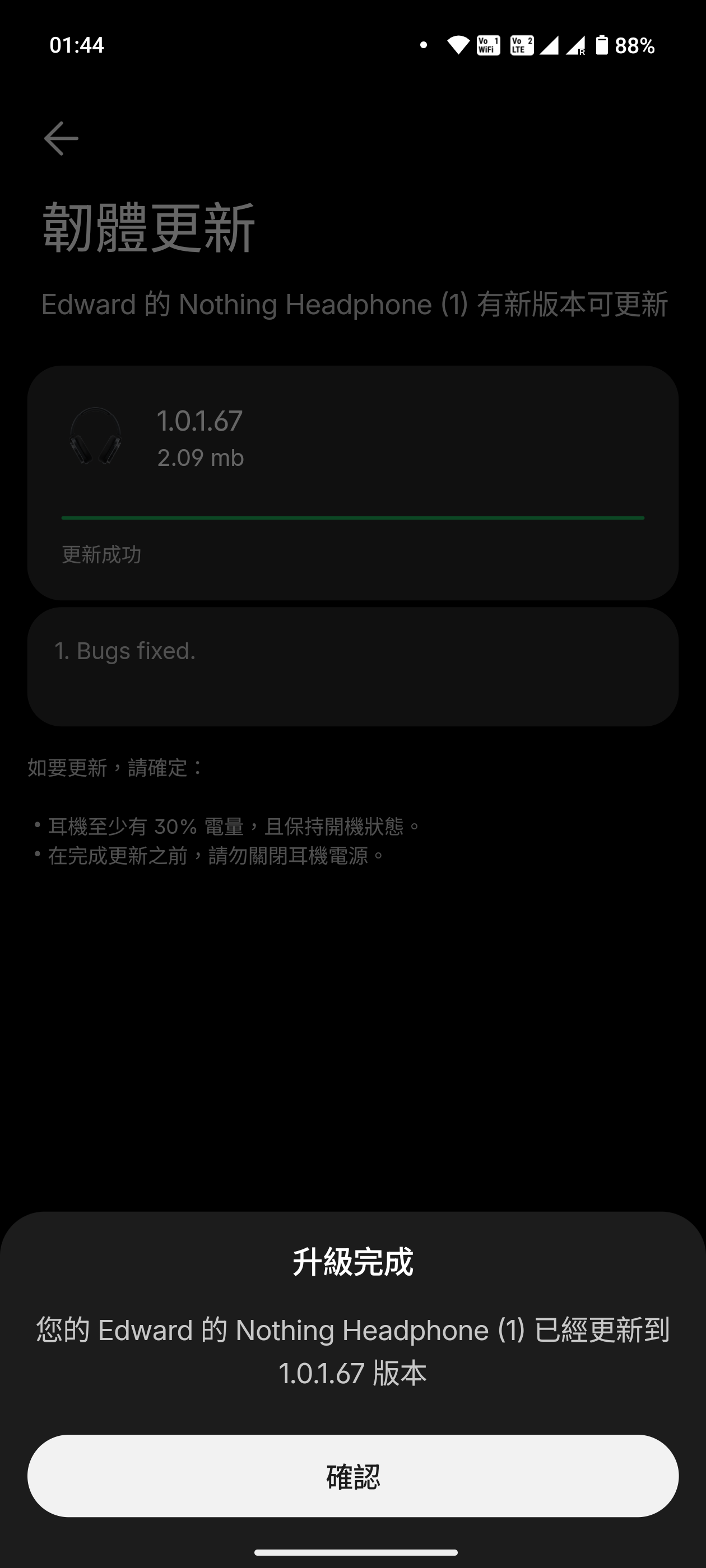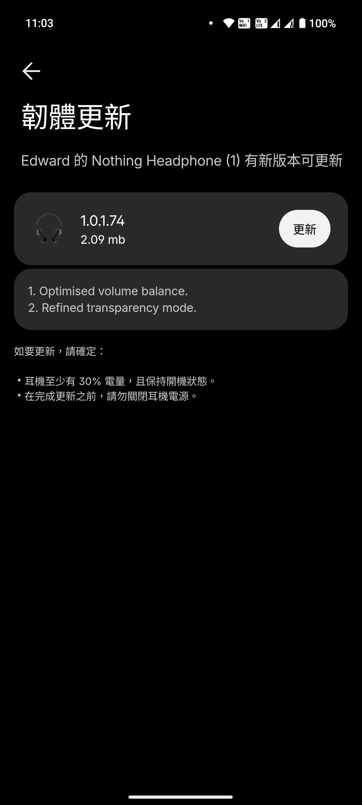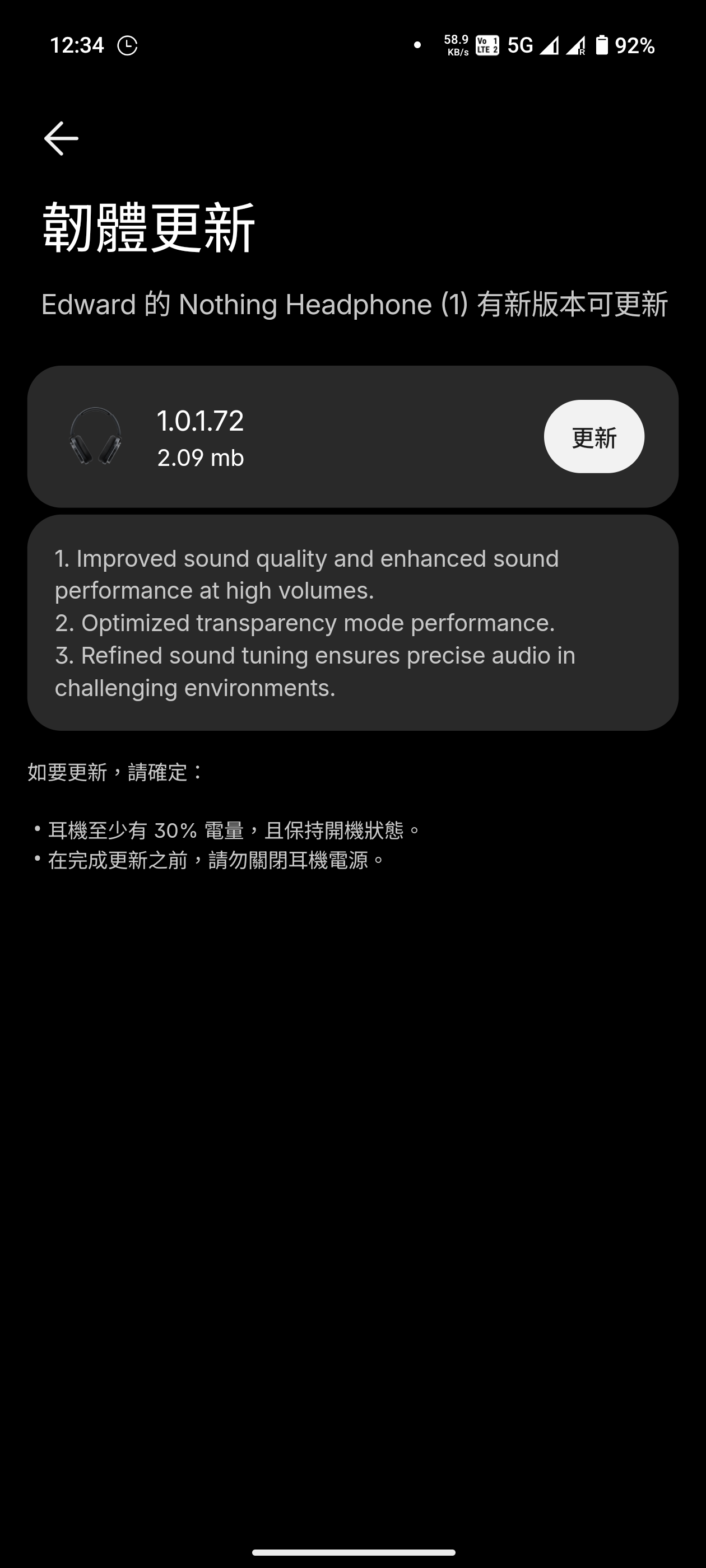 在我收到耳機之後,經歷了三個版本的韌體更新,都是透過 Nothing X 的 APP 來完成的,Nothing 在這點做得相當不錯