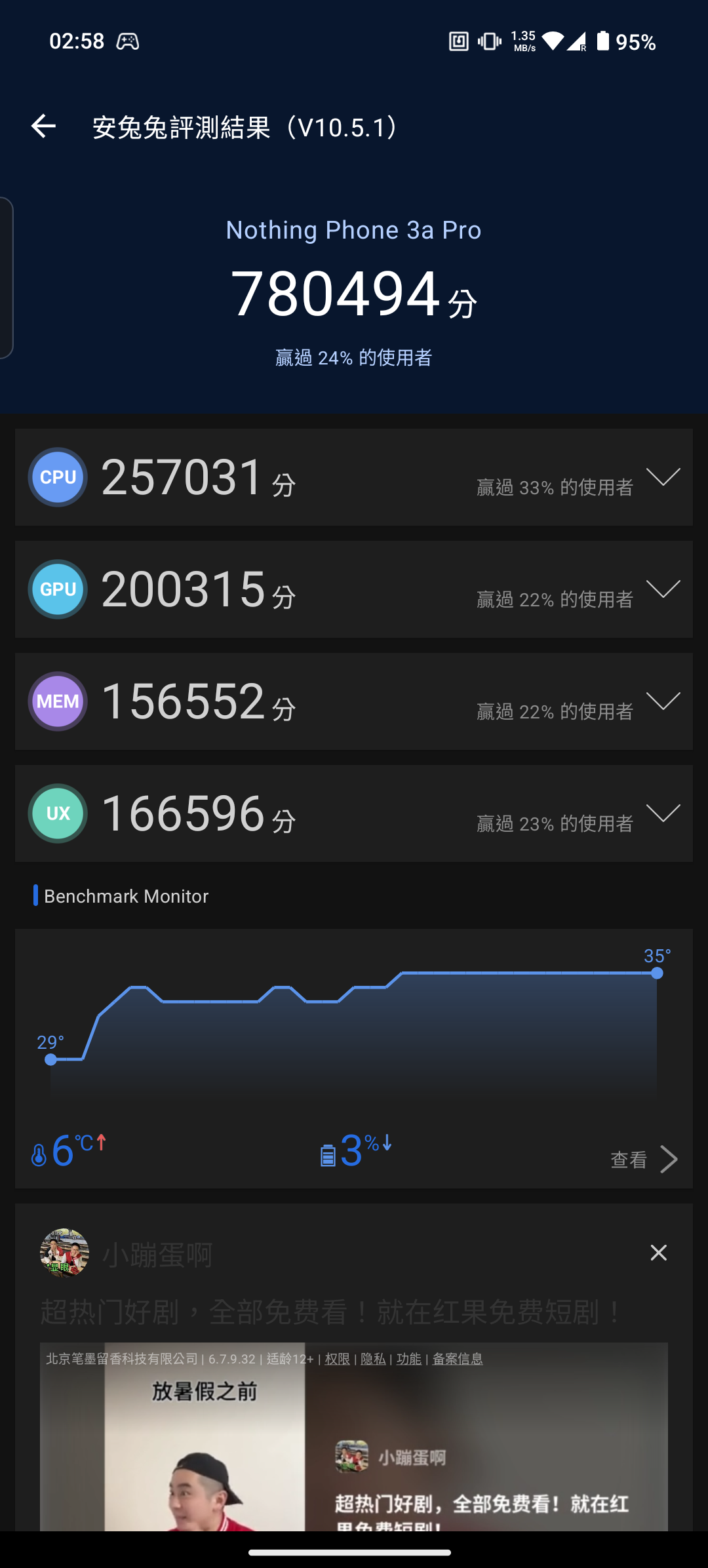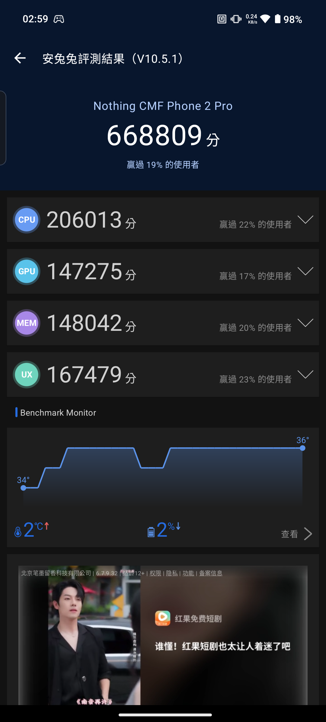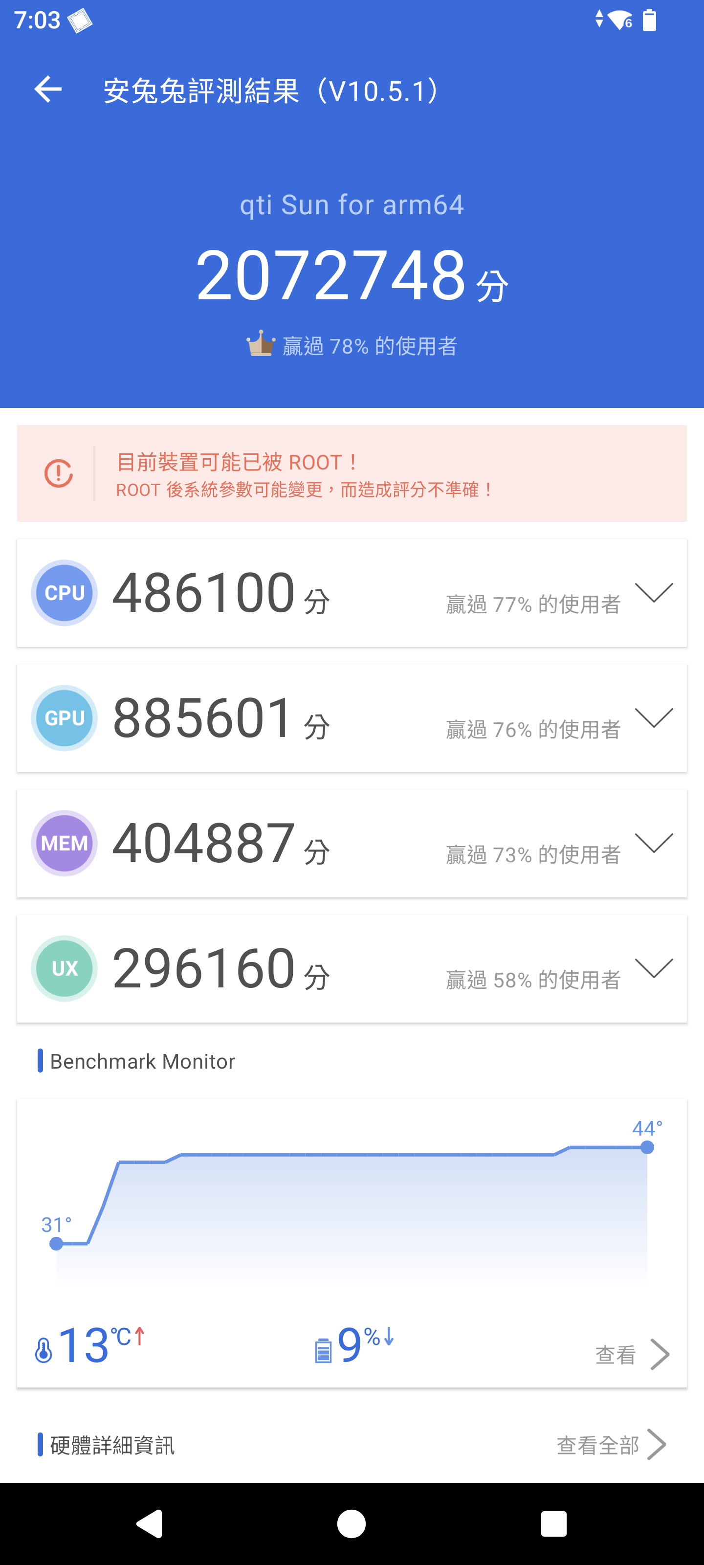 另外,網路上目前對於 Snapdragon 8s Gen4 的評價,絕大多數都認為這顆 SOC 蠻熱的,我必須誠實地說,這顆 SOC 確實是會有發熱的情形。但僅限於在高負載的條件之下,一般日常使用,其實一點也不燙,甚至連溫都說不上,不過 QRD8735 一旦開始跑效能測試,那可說是相當燙手,燙到我一度無法從桌上拿起來。