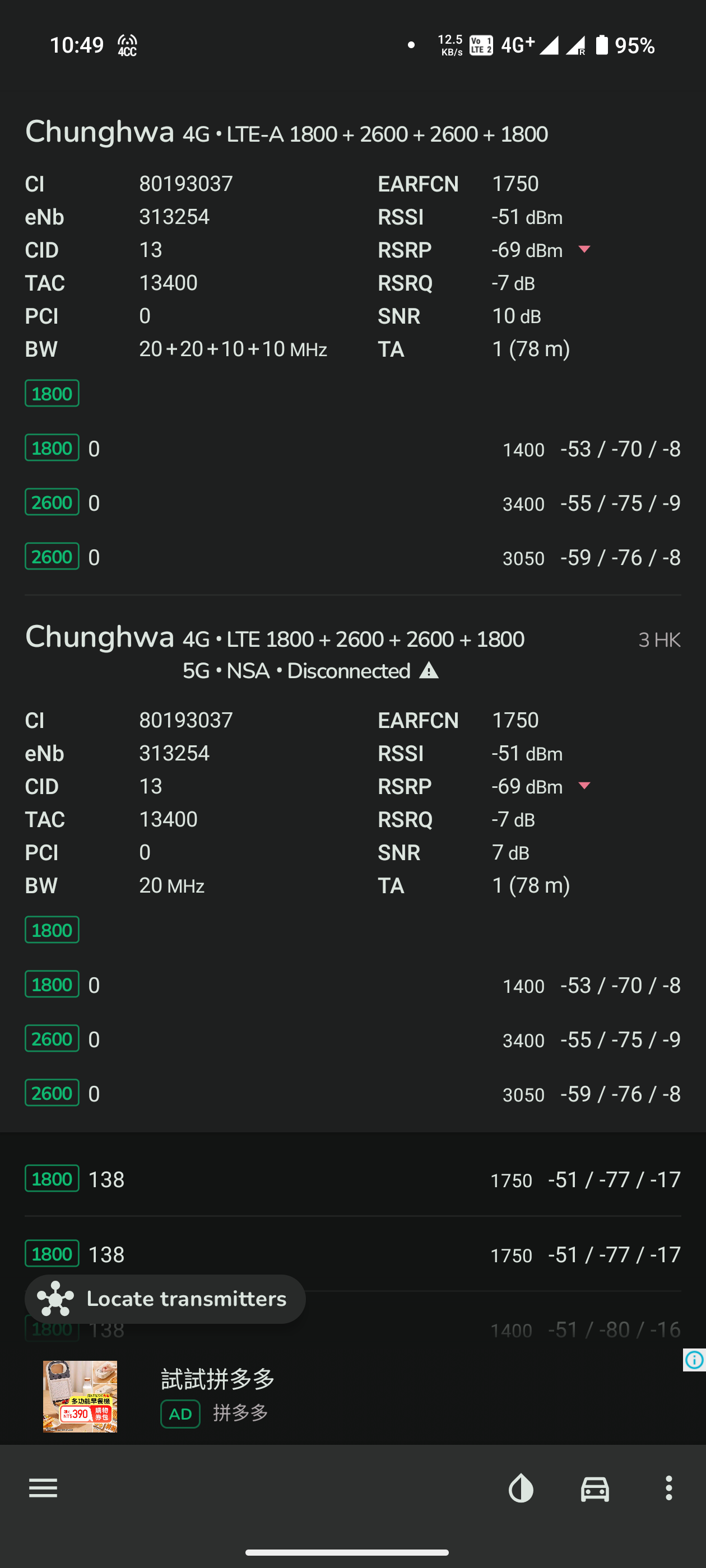從 Nothing Phone (2) 升級上來的使用者,會在網路方面很有感,首先,Nothing Phone (3) 支援了中華 4CA(或許有 5CA 也說不定,但我的生活圈要遇到 5CA 要點運氣以及找角度,大多數時候還是 4CA) 原本在 Nothing Phone (2) 只有中華 3CA,遇到一些極限場景會有些不夠力。再者就是,終於升級上 WiFi 7 了,雖然這個其實是得益於 SOC 的升級,且在熱點分享的部分,也有提供 6Ghz 的選項可以供使用者選擇。