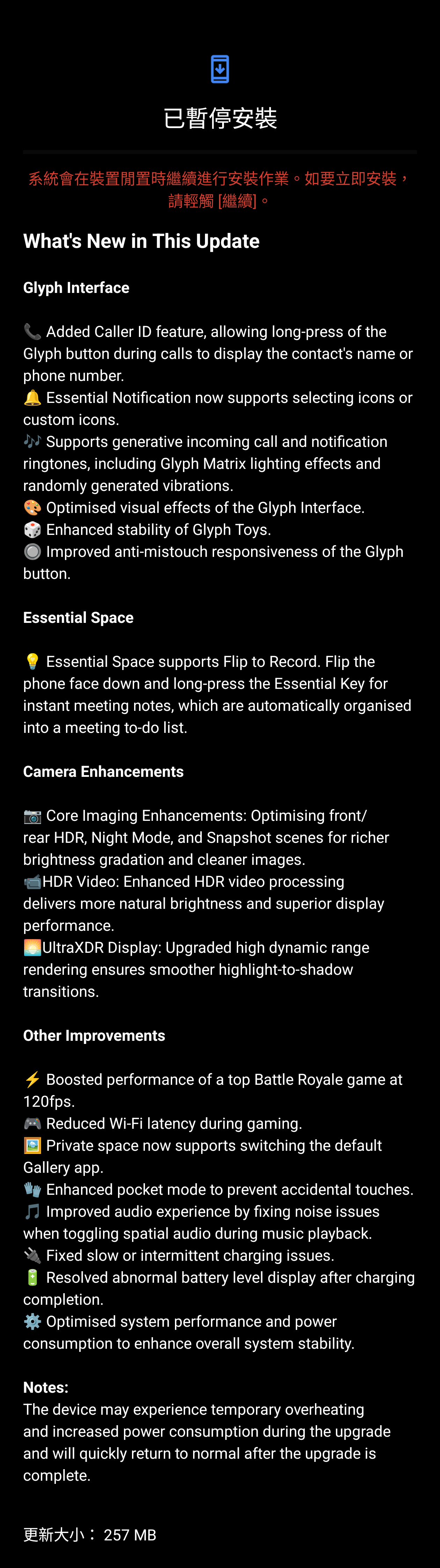 而我收到的第一版更新 ChangeLog 不是 ChangeLog,居然是 Nothing Phone (3) 的 Product Manager 寫給首發評測者的一段話,蠻特別的,在過往甚至是其他品牌當中,不曾看見過的,這對於 Nothing Tech 的這類型新創公司,產現出了相當開放的態度,也再次證明 Nothing Tech 不是一間傳統的手機品牌公司。 第二版更新推出之後,也解決不少問題以及最佳化許多功能,由此可見,Nothing 的系統開發,是真的有一定的功力。畢竟軟體開發團隊可是都在台灣,甚至是原本從一加 OnePlus 一路到現在 Nothing 的人馬。