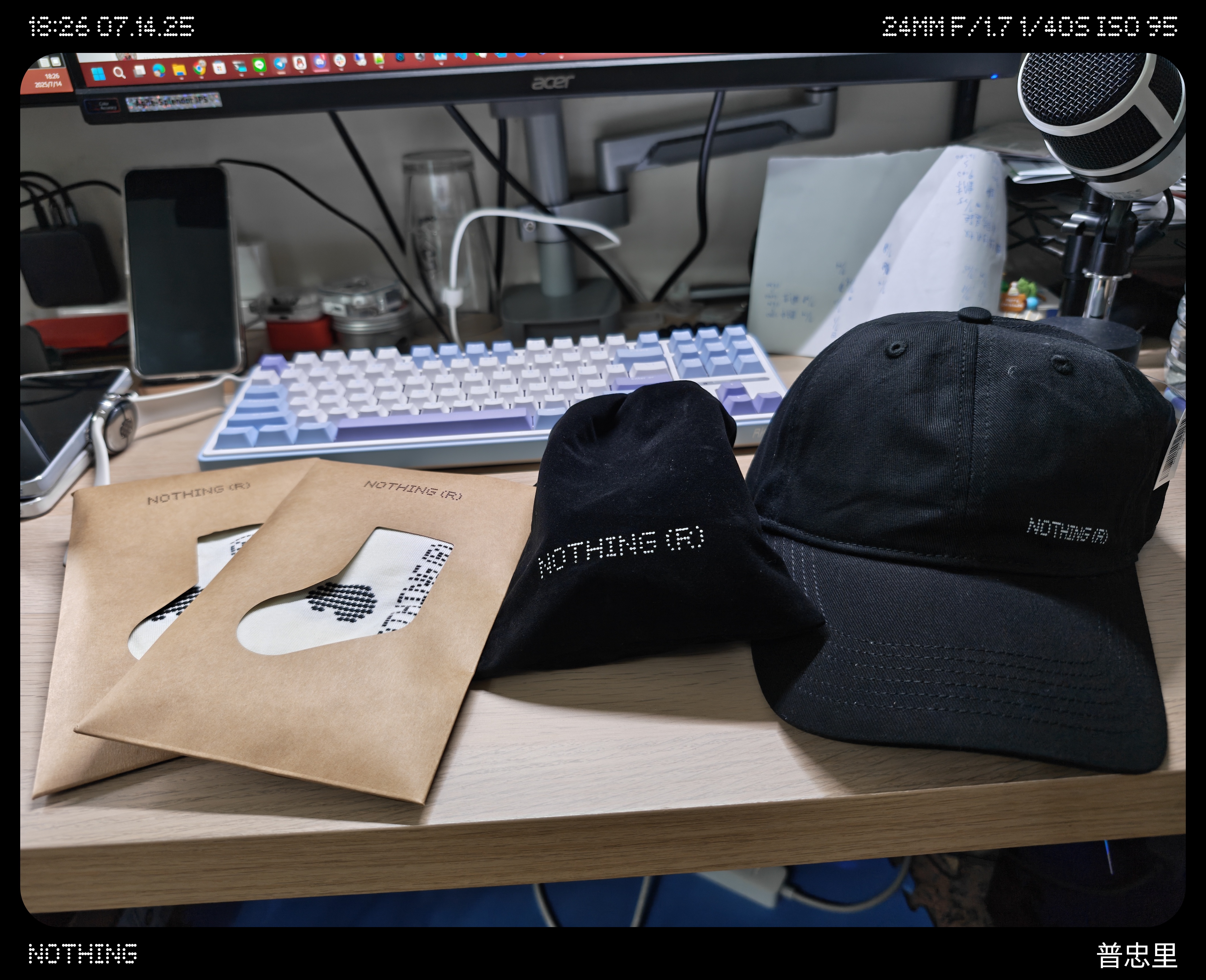 特別感謝 Nothing Tech Taiwan 的夥伴接待,也有幸收到一些紀念品,分別是兩雙 Nothing 的襪子,一個手機掛繩,一頂 Nothing 的帽子。
