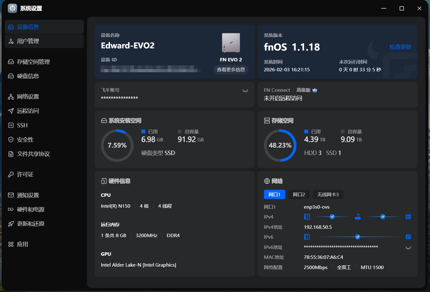 飛牛 Evo 2 是我的「影音中心」。 我用 SSD 快取 武裝了它,讓 N150 的效能得以釋放。它負責提供最極致的 4K 觀影體驗,處理那些高碼率的藍光原盤。它是前端的明星。