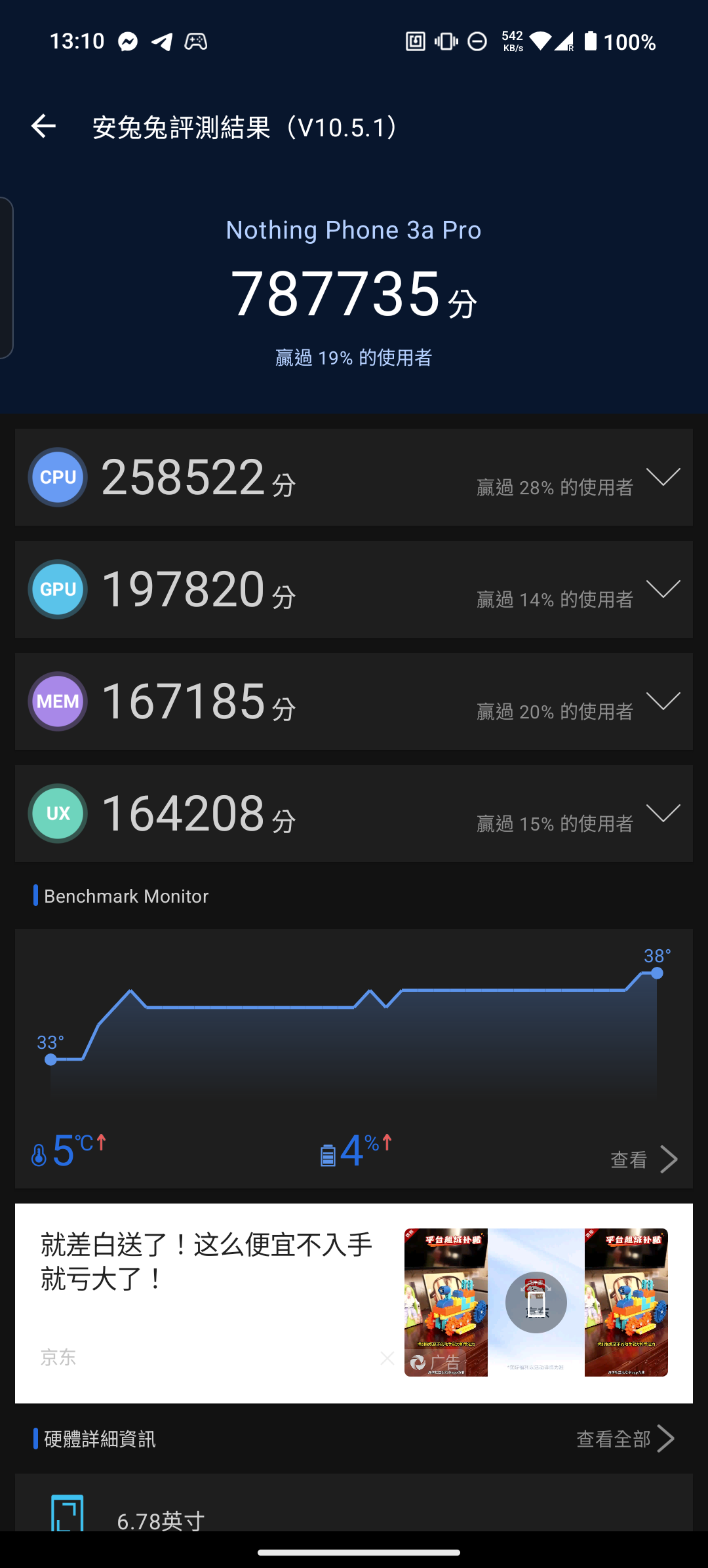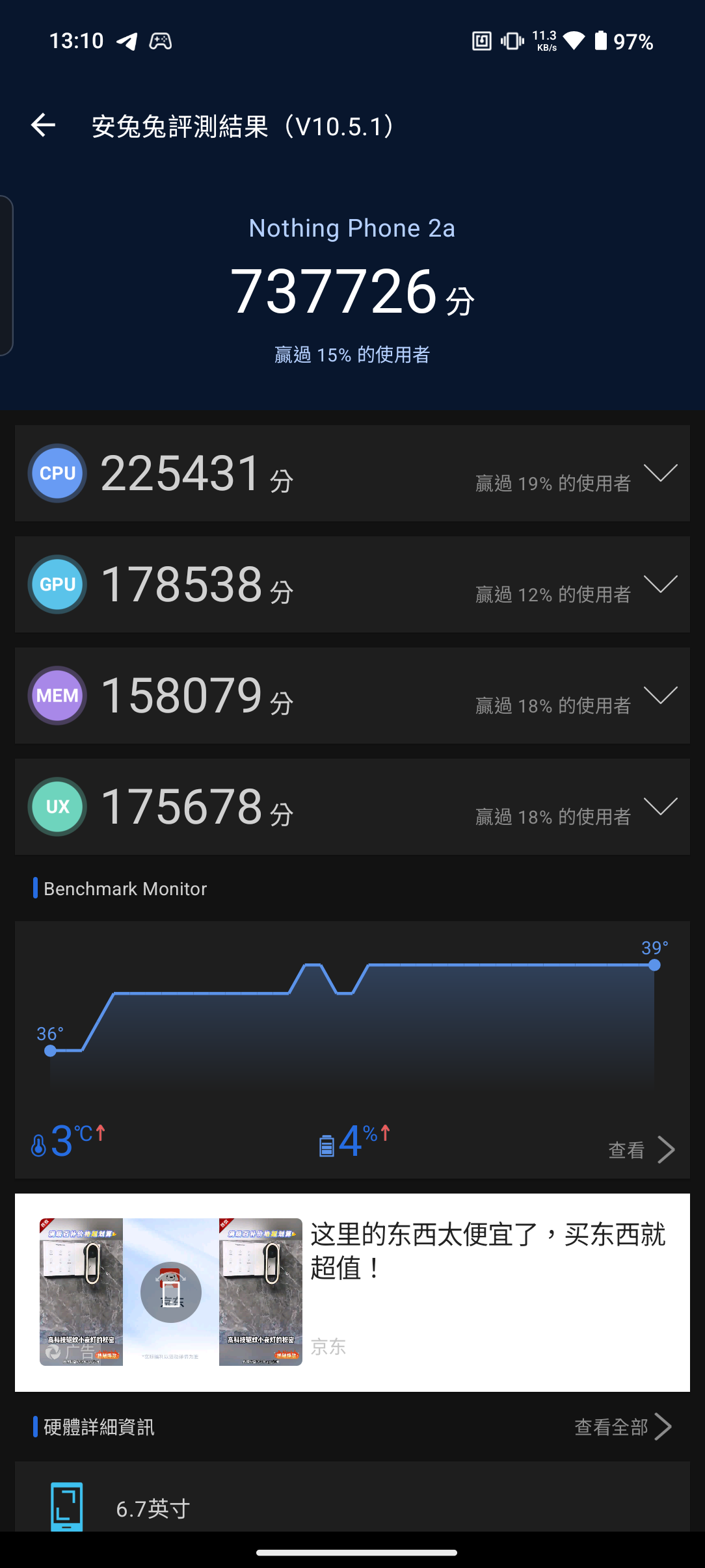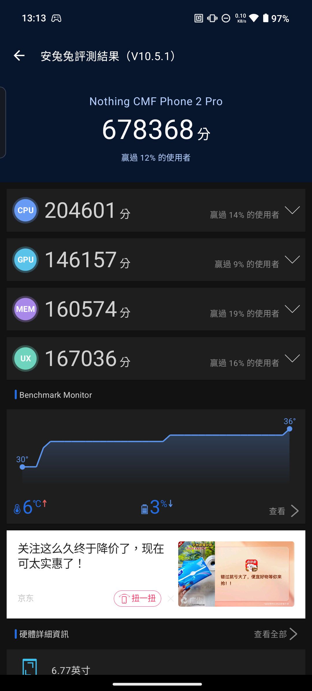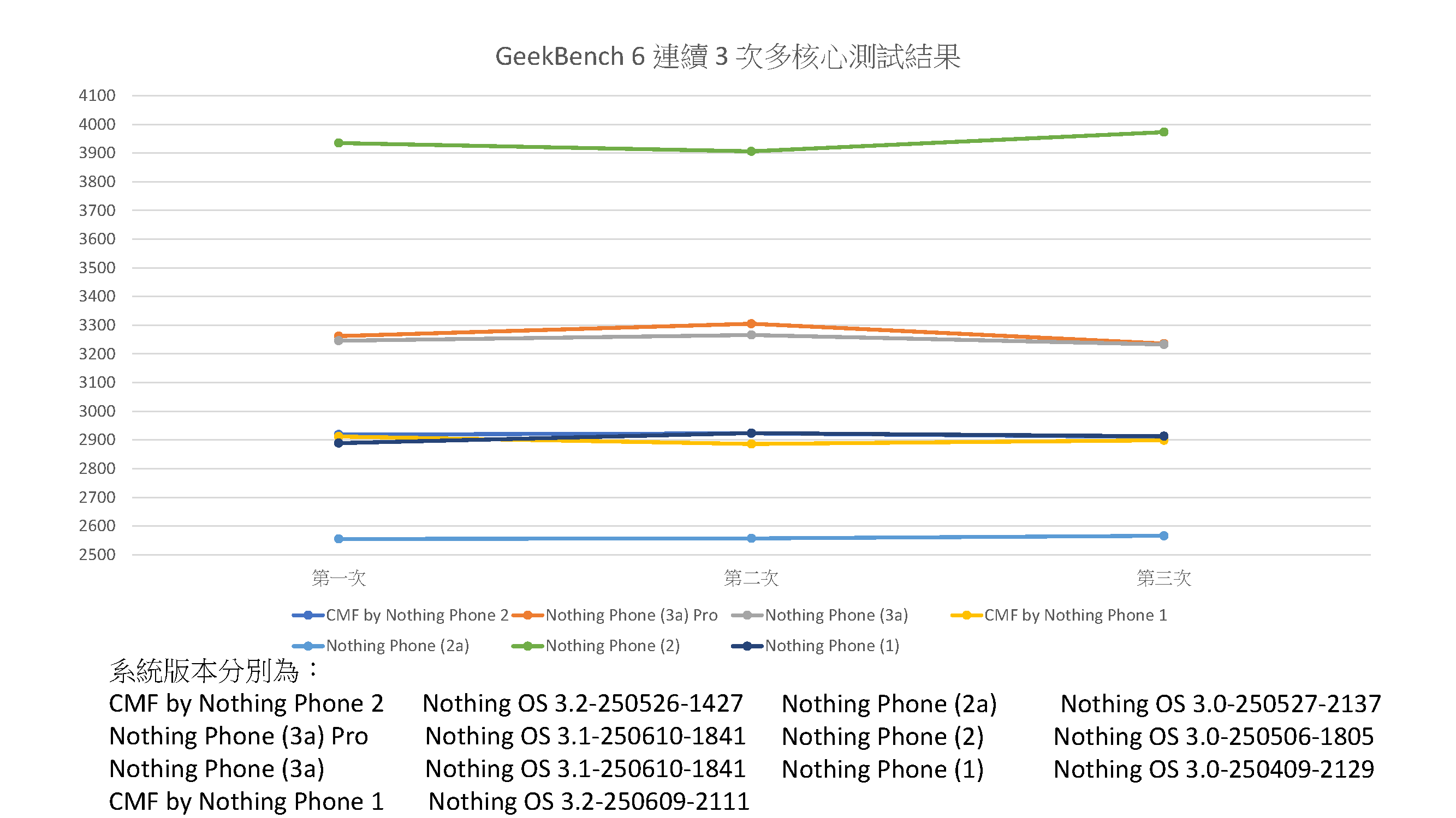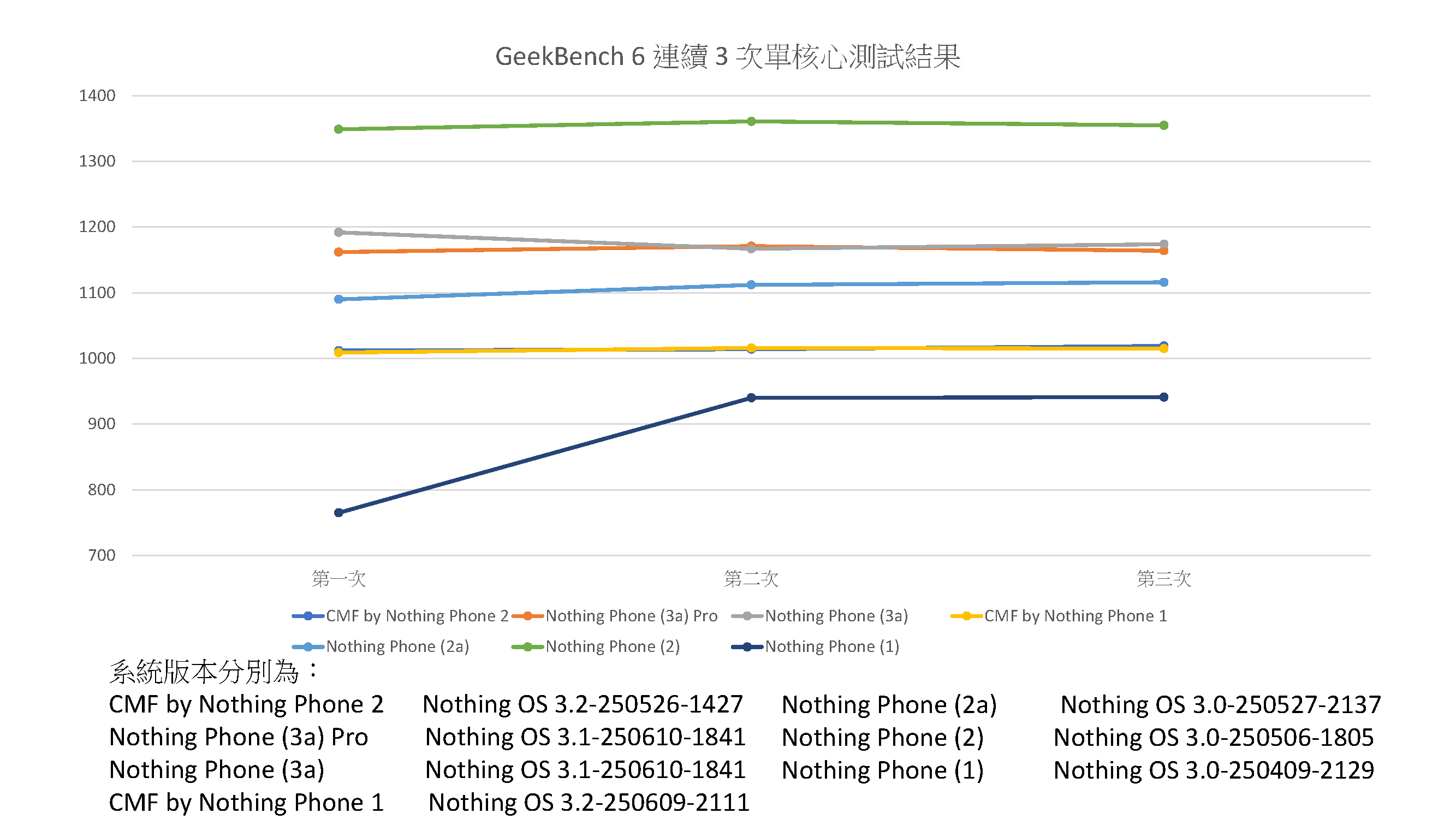 而我這邊也幫各位做成圖表,可以更能判斷出效能高低。 可以從跑分結果得知,3a 與 3a Pro 畢竟是雙生機種,跑分只有些微差距。 而這次的主角 CMF Phone 2 Pro 的跑分成績,與上一代的 CMF Phone 1 差距也不大,由於兩台所搭載的 SOC 都還是聯發科天璣 7300(CMF Phone 2 Pro 搭載的是天璣 7300 Pro),本質上還是同一顆 SOC。